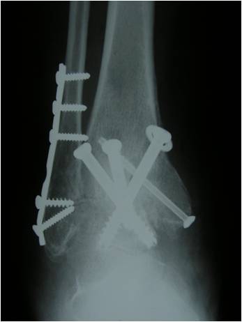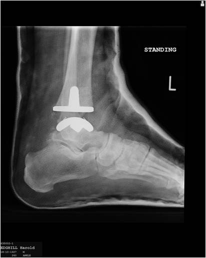 When conservative (non-operative) measures such as activity modification, painkillers and orthotic supports are no longer adequate, surgery may become necessary. Ankle or other hind foot joint stiffening operation (fusion or arthrodesis, Fig 2) has been the surgery of choice and can be performed both as an open and as a keyhole procedure. The trade-off is pain reduction for increased stiffness but other than in the knee or hip joint fusion is relatively well tolerated and the functional results are surprisingly good. More recently results from modern ankle replacing prostheses (Fig 3) have been improving, offering this as a suitable alternative for selected patients.
