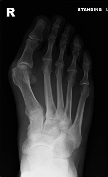 Symptoms include pain in the bump area with or without shoes and occasionally associated discomfort in the ball of the foot (metatarsalgia) and/or lesser toe deformities (Fig 2) such as a hammertoe from direct pressure of the big toe. The diagnosis is confirmed by clinical assessment and x-rays (Fig 3).