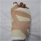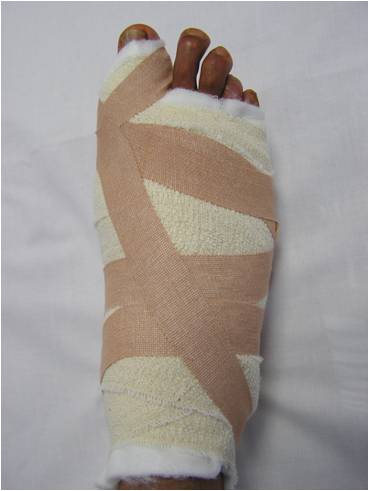 Bunion surgery is carried out as a day case procedure under general, spinal or regional anaesthesia. A regional ankle block (with local anaesthetic) is routinely used for postoperative pain relief (usually lasting 6-8hours). Postoperatively a soft bandage protects the foot (Fig 5) and mobilisation is through a solid-soled postoperative shoe (Fig 6).